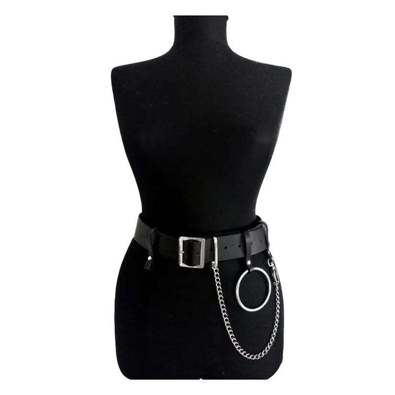 80% OFF 2019 Women Gothic Punk Waist Belt Chain Metal Circle Ring Design Silver Pin Buckle Leather Black Wa